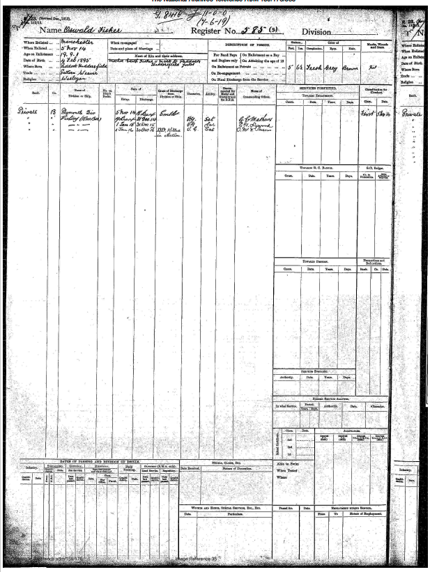 FISHER, OSWALD. Private. No PLY/585(S). Royal Marine Light Infantry. 2nd R.M. Battalion Royal Naval Division. Born Paddock 4.2.1895. Son of Thomas D. and Edith Fisher, 11 Mark Street, Paddock.